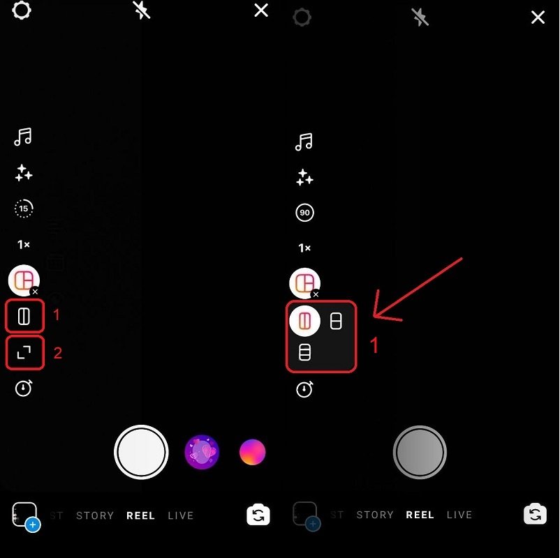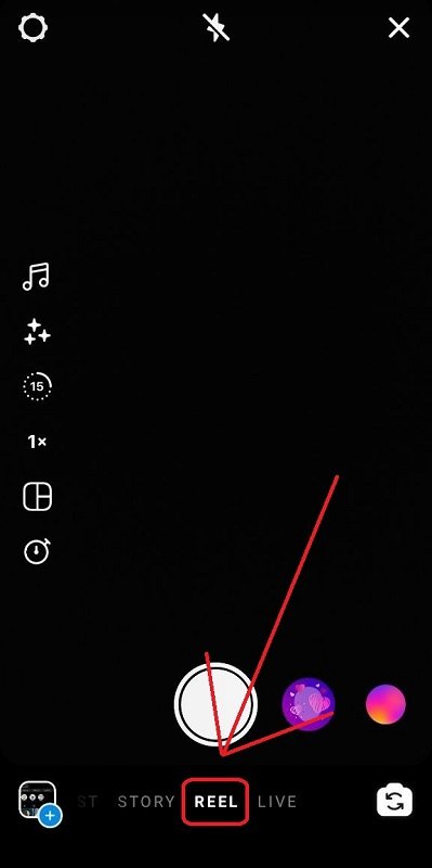 در پایین صفحه حالتهای مختلف مانند پست ، استوری ، لایو و ریلز را مشاهده میکنید . به روی Reel بروید .