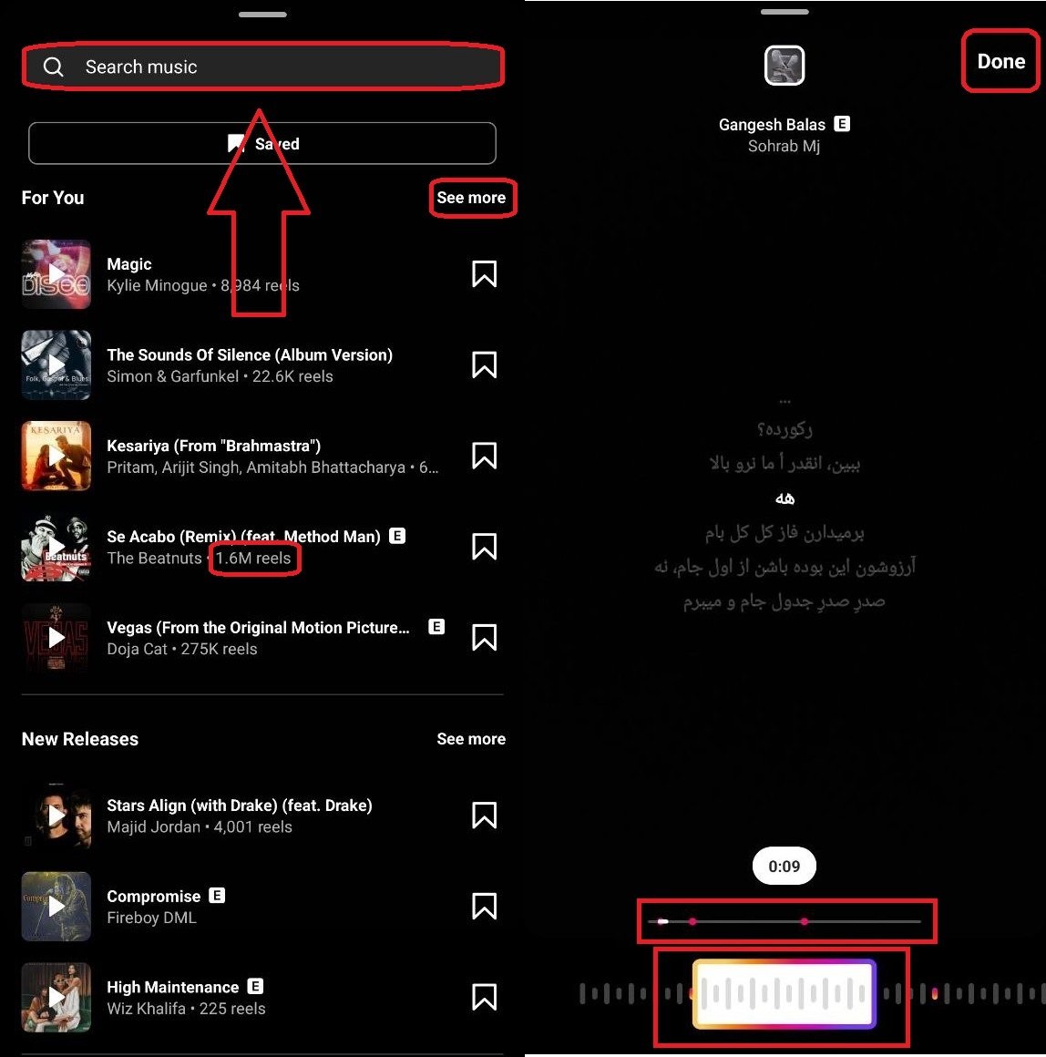 در این بخش شما میتوانید موسیقی موردنظر خود را از پیشنهادیهای خود اینستاگرام و یا سرچ باکس انتخاب کنید ولی قابلیت انتخاب موسیقی از داخل فایلها امکانپذیر نیست ; زیرا یکی از قابلیتهای این بخش نمایش تعداد ریلز های ضبطشده با این موسیقی است همچنین اینستاگرام برای جلوگیری و حفظ قوانین کپیرایت این بخش را اضافه نکرده است . پس از انتخاب موسیقی میتوانید بخشی موردنظر از موسیقی را برای ضبط انتخاب کنید . یکی از ویژگیهای کاربردی این بخش مشخص بودن قسمتهای مناسب و پیشنهادی خاصی است که چالشها را زیباتر میکند .