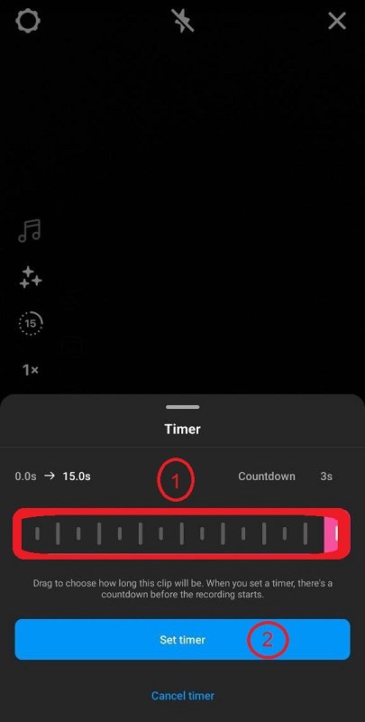 اخرین ابزار قابل استفاده در ریلز تایمر است . تایمر به صورت خودکار ویدیو را پس از مدت زمان مشخصی که شما تعیین میکنید متوقف میکند و شما نیازی به متوقف کردن دستی ندارید . تایمر تا 15 ثانیه قابل تنظیم خواهد بود.