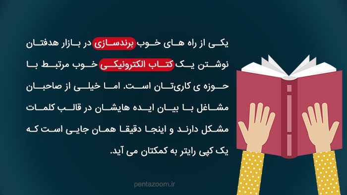 یکی از راه های خوب برندسازی در بازار هدفتان نوشتن یک کتاب الکترونیکی خوب مرتبط با حوزه ی کاریتان است. اما خیلی از صاحبان مشاغل با بیان ایده هایشان در قالب کلمات مشکل دارند و اینجا دقیقا همان جایی است که یک کپی رایتر به کمکتان می آید. با انتشار یک کتاب الکترونیکی حرفه ای و آموزنده می توانید به یک قشر جدیدی از مخاطبین دسترسی پیدا کنید و همزمان باعث افزایش اعتبار کسب و کارتان در صنعت مربوطه هم می شود.
