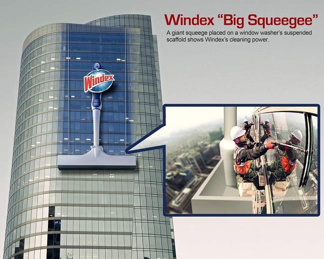 در این تبلیغ خلاقانه برند Windex با استفاده از یگ برج و نصب یک شیشه پاک کن غول پیکر بر روی برج و رنگی کردن قسکت تمیز شده ، خودش را در زمینه شیشه پاک کن به نحو احسنت تبلیغ کرده است . این برند تخصص حرفه ای در زمینه محصولات شیشه دارد اما امروزه وارد دیگر صنایع شویندگی و بهداشتی نیز وارد شده است .