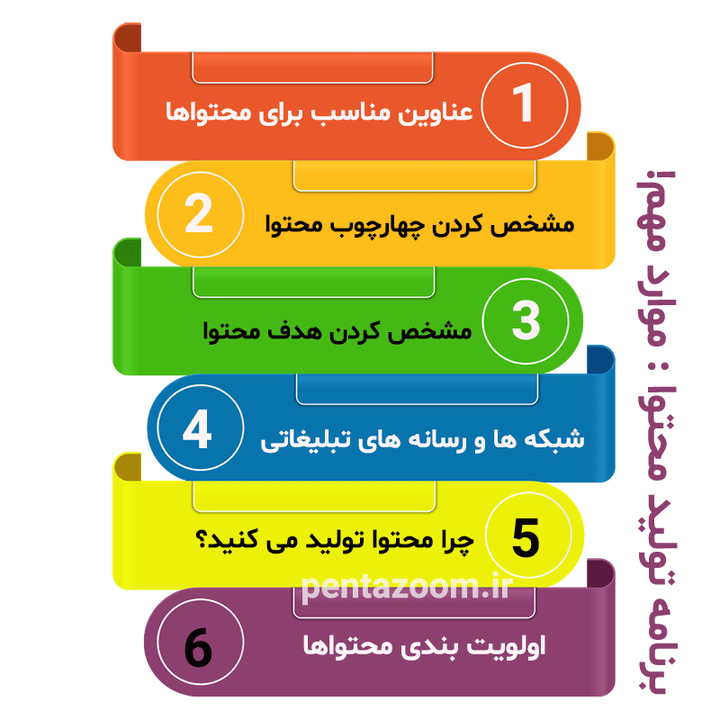 با توجه به ارزیابی های خود و خلا هایی که شناسایی کردید یک برنامهی تولید محتوا تهیه کنید و در آن مطالبی که به شما در رسیدن به هدفتان کمک می کنند را شرح دهید. این برنامه باید شامل موارد زیر باشد: