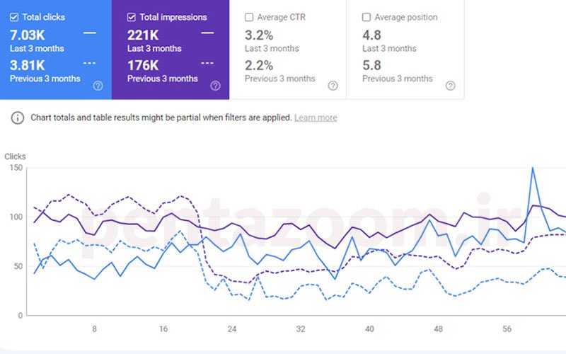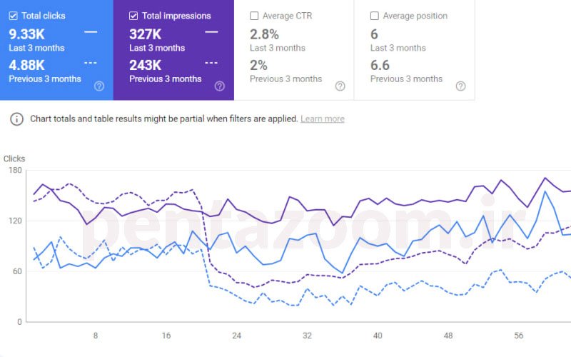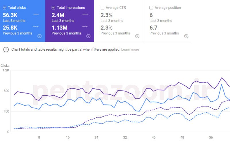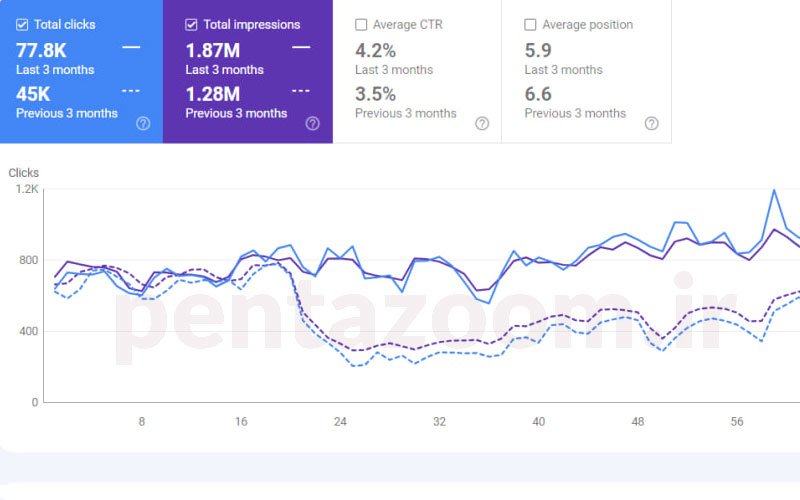 پس می توان گفت صرفا افزایش تعداد بازدید نمی تواند ملاک خوبی برای سنجش بهترین استراتژی سئو باشد. در تصاویر زیر می خواهیم نمونه استراتژی سئو از منظر افزایش تعداد کلیک روی کلمات خریدار سایت ها را با هم ببنیم که همه نمونه های موفق اجرا شده در پنتازوم هستند. به جهت حفظ حریم شخصی آدرس دامنه ها نشان داده نمی شوند.